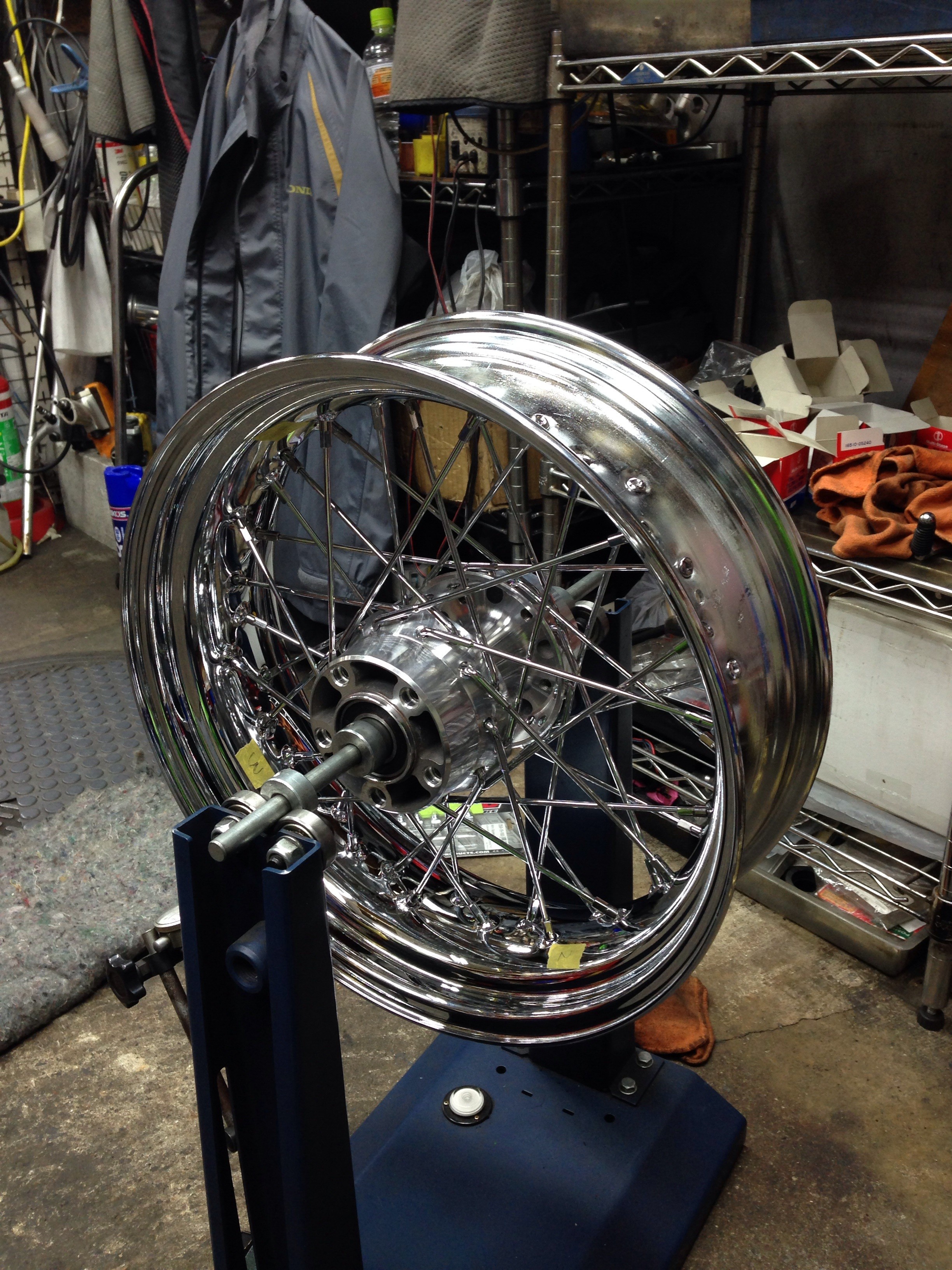 店のピットには伊豆より持ち込まれたハーレーの5インチワイドリムがあります。