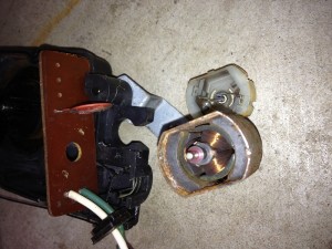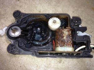カバーを開けてみると、水が入ったんでしょうか、モーターがサビサビで軸が固着していました。